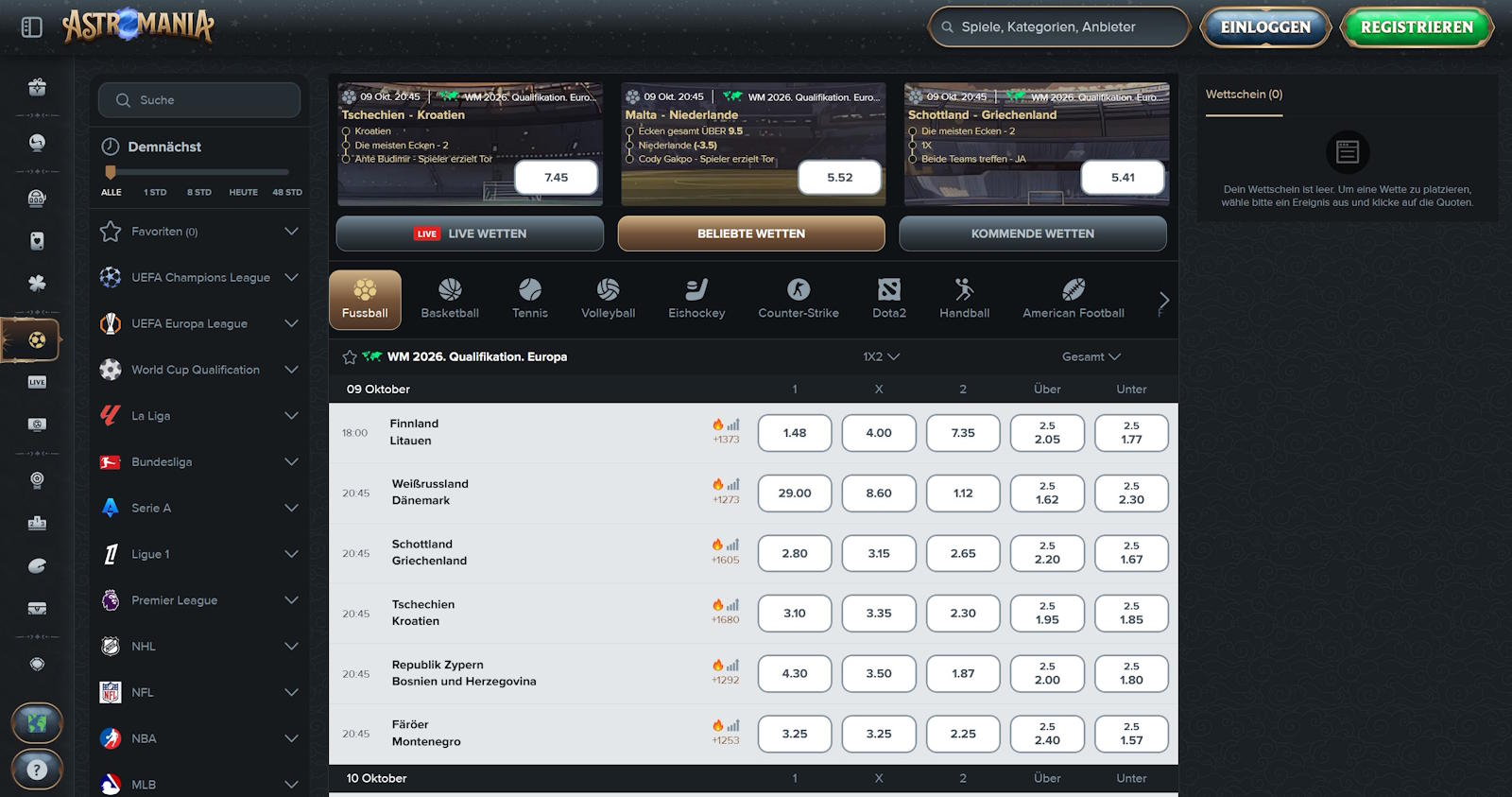 AstroMania Spielauswahl und Wettmöglichkeiten