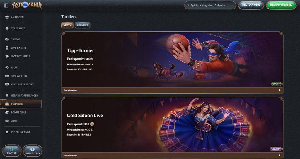 Bonusbedingungen und Konditionen 1.Dieses Angebot gilt nur für Neukunden, die sich auf unserer Website registriert und dort ihre erste Echtgeld-Einzahlung getätigt haben. 2.Mit der ersten Einzahlung in Höhe von mindestens 20 EUR erhältst du 1 Gratis-Pick bei der Bonuskrabbe. Ein Spieler kann sie nutzen, indem er den Bereich Bonuskrabbe besucht. 3.Die Mindesteinzahlung, um einen Bonus für die erste, zweite, dritte oder vierte Einzahlung zu erhalten, beträgt 20 EUR. 4.Die erste Einzahlung kann einen 100%igen Bonus bis zu einem Maximalbetrag von 1,000 EUR und 200 Freispiele aktivieren. 5.Die zweite Einzahlung kann einen Einzahlungsbonus von 75% bis zu einem Höchstbetrag von 500 EUR aktivieren. 6.Die dritte Einzahlung kann einen 50%igen Einzahlungsbetrag bis zum Maximalbetrag von 500 EUR und 50 Freispiele aktivieren. 7.Die vierte Einzahlung kann eine 25%ige Einzahlung bis zum Maximalbetrag von 1,000 EUR und 100 Freispiele aktivieren. 8.Der Bonus wird sofort nach einer erfolgreichen Einzahlung gutgeschrieben. Bitte kontaktieren Sie uns per Live-Chat oder E-Mail unter support@astromania.com, sollte der Bonus nicht gutgeschrieben werden. 9.Jeder der Willkommensboni kann nur beansprucht werden, bevor Wetten mit der Ersteinzahlung getätigt werden. 10.Eine Auszahlungsanforderung vor Inanspruchnahme des Bonus oder nach Aktivierung des Bonus führt zur Aufhebung der Bonusberechtigung. 11.Einzahlungen über Neteller oder Skrill berechtigen nicht zur Teilnahme an dieser Aktion. 12.Ein Spieler kann einen aktiven Bonus jederzeit im Profilbereich oder durch Kontaktaufnahme mit unserem Support-Team stornieren. Durch die Stornierung des Bonus wird der gesamte Betrag im Casino-Bonusguthaben ungültig. 13.Der maximale Einsatz, der während eines aktiven Casino-Bonus erlaubt ist, beträgt 5 EUR. 14.Für alle Boni aus dem Willkommenspaket gilt eine 35-fache Umsatzbedingung, die der Summe aus Einzahlung und Bonusbeträgen entspricht. 15.Verschiedene Spiele tragen unterschiedlich zur Bonusfreigabe bei. Die vollständigen Bedingungen für den Casino Bonus findest du im Abschnitt 7 der Allgemeinen Geschäftsbedingungen. 16.Die Umsatzbedingungen für einen Bonus müssen innerhalb von 10 Tagen nach Aktivierung des Bonus erfüllt erden. Sollte der Umsatz in diesem Zeitraum nicht erfüllt werden, werden der Bonusbetrag und mögliche Gewinne ungültig. 17.Dieser Bonus kann nicht gleichzeitig mit anderen Boni (Aktionen) kombiniert werden. Wenn du einen anderen Bonus aktivierst oder Freispiele in Anspruch nimmst, während du einen aktiven Bonus hast, werden der aktuelle aktive Bonus und alle entsprechenden Gewinne automatisch entfernt. 18.Diese Aktion ist nicht befristet. Unsere Website behält sich jedoch das Recht vor, die Aktion nach eigenem Ermessen und ohne vorherige Ankündigung zu ändern und zu beenden. 19.Diese Aktion ist in Übereinstimmung mit den Allgemeinen Geschäftsbedingungen gültig.