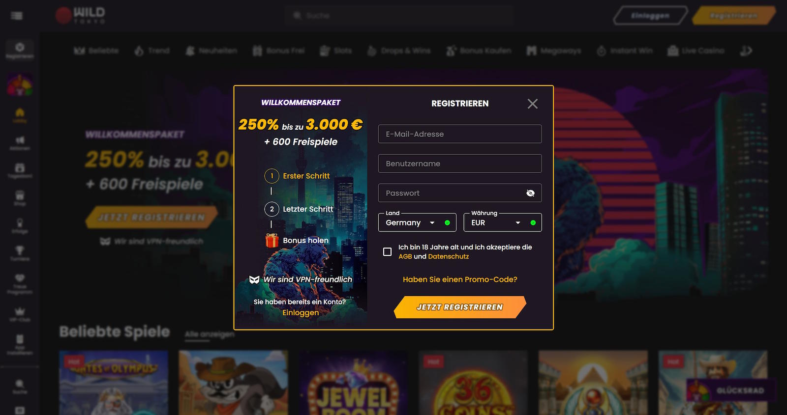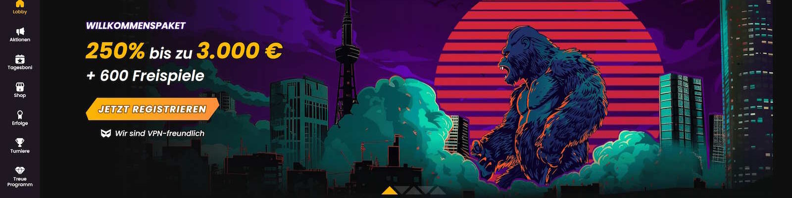 2. Der Gesamtbonus des Willkommenspaket beträgt 250% bis zu 3000 € + 600 Freispiele.